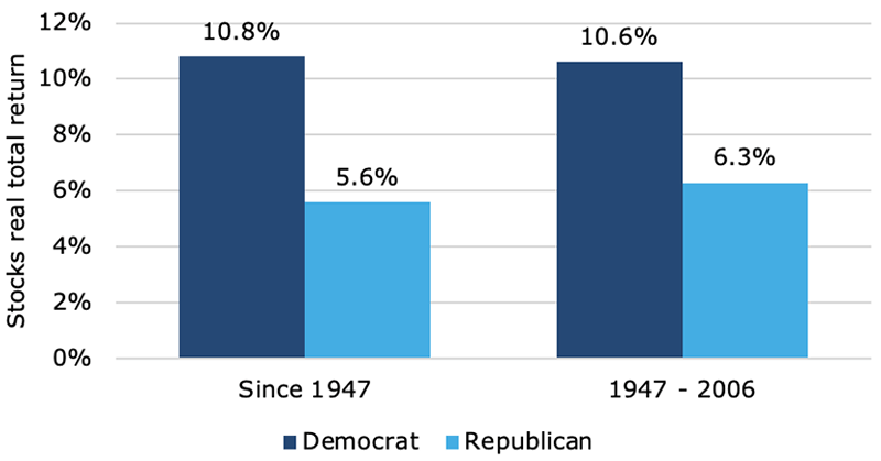 2) On average, stock market growth is stronger under Democrats. Again comparing the period since 1947, data shows that markets grew an average of 10.8 percent under Democratic presidents, compared to 5.6 percent for under Republican presidents.